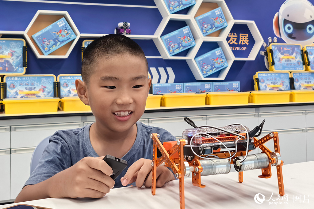 A boy smiles with curiosity as he uses AI-empowered devices at an AI exhibition and demonstration center operated by People's Daily online, in Wuhan, central China's Hubei Province, Aug. 13, 2024. (People's Daily Online/Zhou Wen)