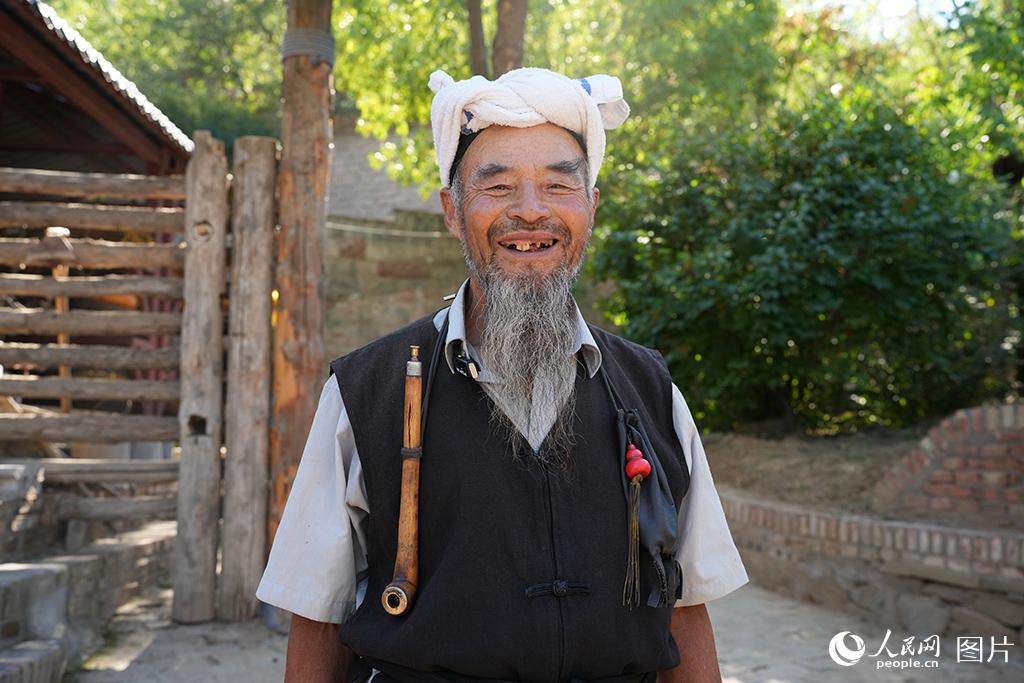 Actor Gao Hehe smiles happily backstage before performing in a live outdoor play named "A cow on the high mountain" in Chiniuwa village, Jiaxian county, Yulin city, northwest China's Shaanxi Province, Aug. 13, 2024. (People's Daily Online/Jia Kailu)