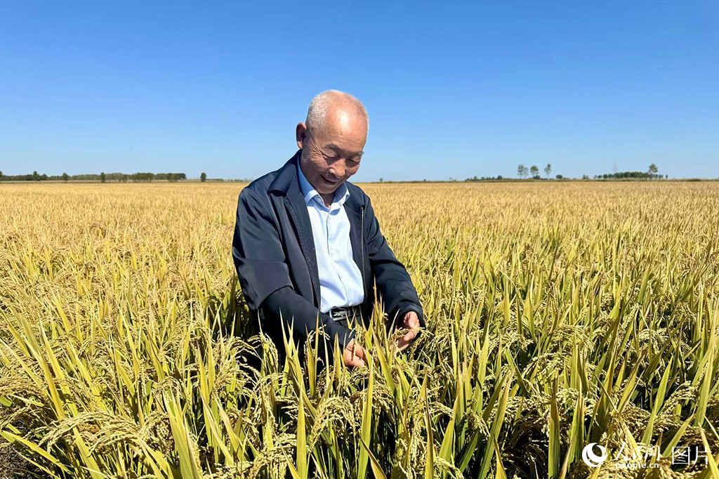Ren Zhiguo, an executive of a farmers' cooperative in Zhenlai county, Baicheng city, northeast China's Jilin Province, smiles joyfully as he inspects the full rice ears in a paddy field, Sept. 22, 2024. (People's Daily Online/Li Siyue)