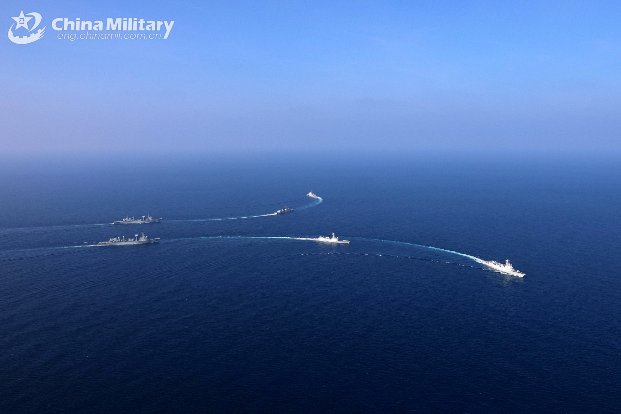 The picture shows naval vessels attached to a flotilla under the navy of the Chinese PLA Northern Theater Command sailing in formation during a maritime training exercise. It's learned that for the past few years, ships attached to the naval flotilla have visited more than 30 countries, and traveled to nine important international straits on five continents and three oceans, fully demonstrating the open, confident, friendly, and cooperative image of the Chinese PLA Navy.