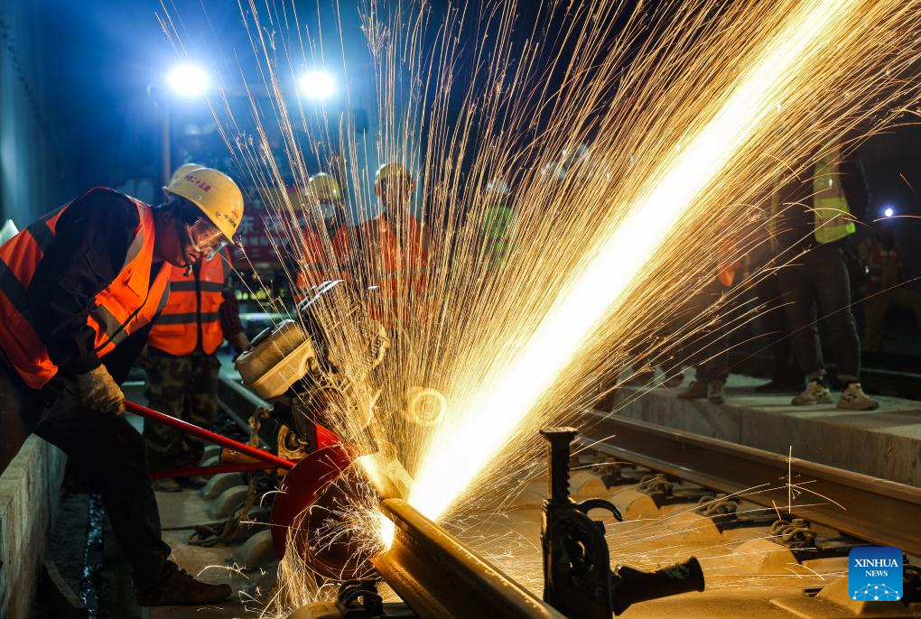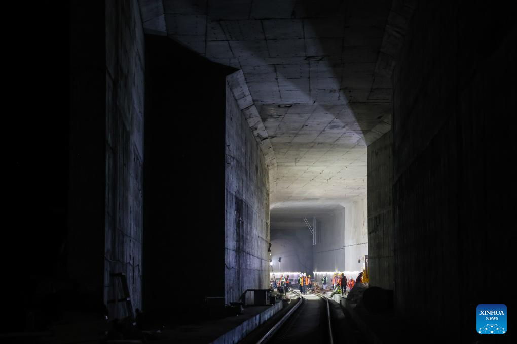 Constructors work at Dayuan Station of the Guangfo (Guangzhou-Foshan) east ring intercity railway in Guangzhou, south China's Guangdong Province, Jan. 6, 2025. The track laying work of the Guangfo east ring intercity railway was completed on Monday. The project is a section of Guangzhou-Foshan circular intercity railway and also an important part of the intercity railway network of the Guangdong-Hong Kong-Macao Greater Bay Area. (Xinhua/Liu Dawei)
