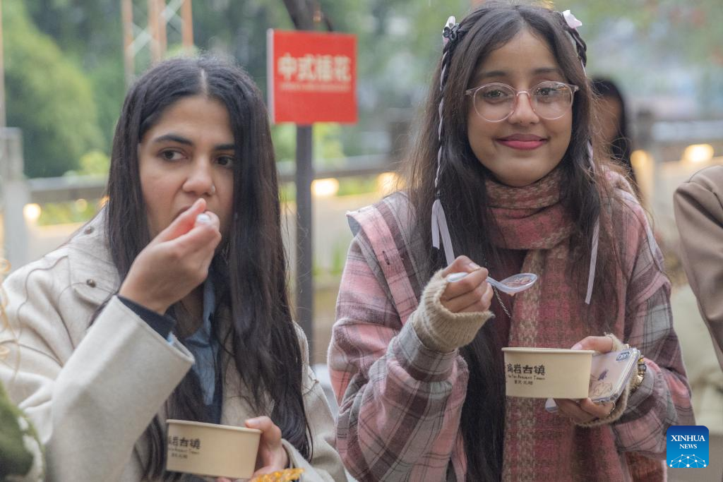 International students taste Laba porridge in Pianyan ancient town, Beibei District, southwest China's Chongqing Municipality, Jan. 7, 2025. A group of international students attended a cultural event here on Tuesday to experience traditional Chinese culture. (Xinhua/Huang Wei)