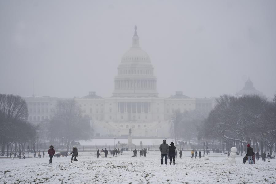 People play in the snow at the National Mall near the U.S. Capitol building in Washington D.C., the United States, Jan. 31, 2021. (Xinhua/Liu Jie)