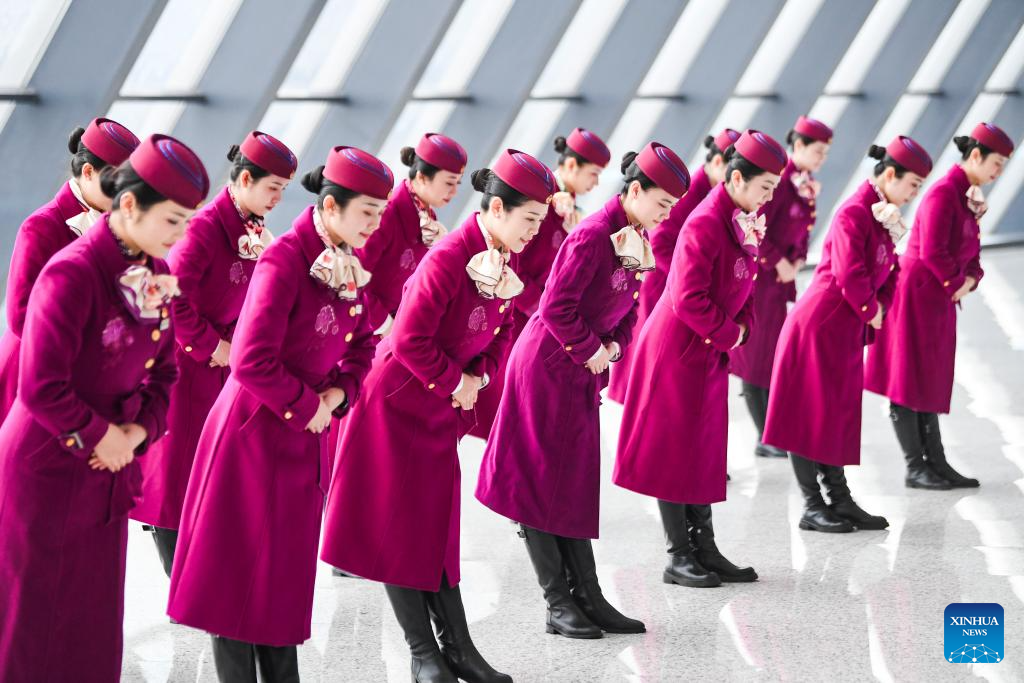 High-speed railway crew members take part in an etiquette training in Chongqing, southwest China, Jan. 8, 2025. The Chongqing branch of China Railway Chengdu Bureau Group Co., Ltd. organized training programs for high-speed railway crew members to improve service quality and prepare for the upcoming Spring Festival travel rush. (Xinhua/Wang Quanchao)