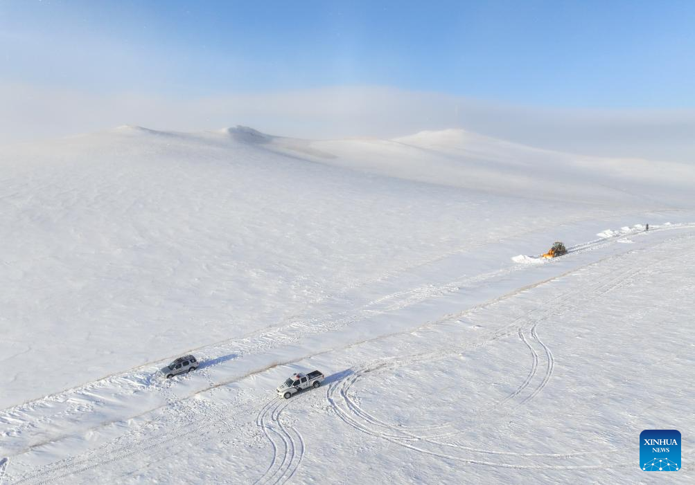 An aerial drone photo shows police rescuing snowbound travelers in Xilin Gol League, north China's Inner Mongolia Autonomous Region, Dec. 27, 2024. (Xinhua/Lian Zhen)