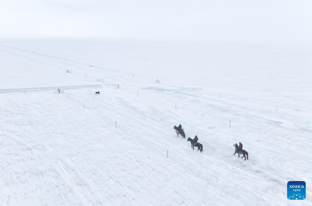 Mounted police deliver parcels to herdsmen in Xilin Gol League, north China's Inner Mongolia Autonomous Region, Dec. 27, 2024. (Xinhua/Lian Zhen)
