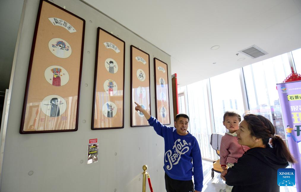 Yang Qiang (2nd R) introduces his Peking Opera facial makeup painting at a cultural center in Shijingshan District in Beijing, capital of China, Jan. 8, 2025. (Xinhua/Li Xin)
