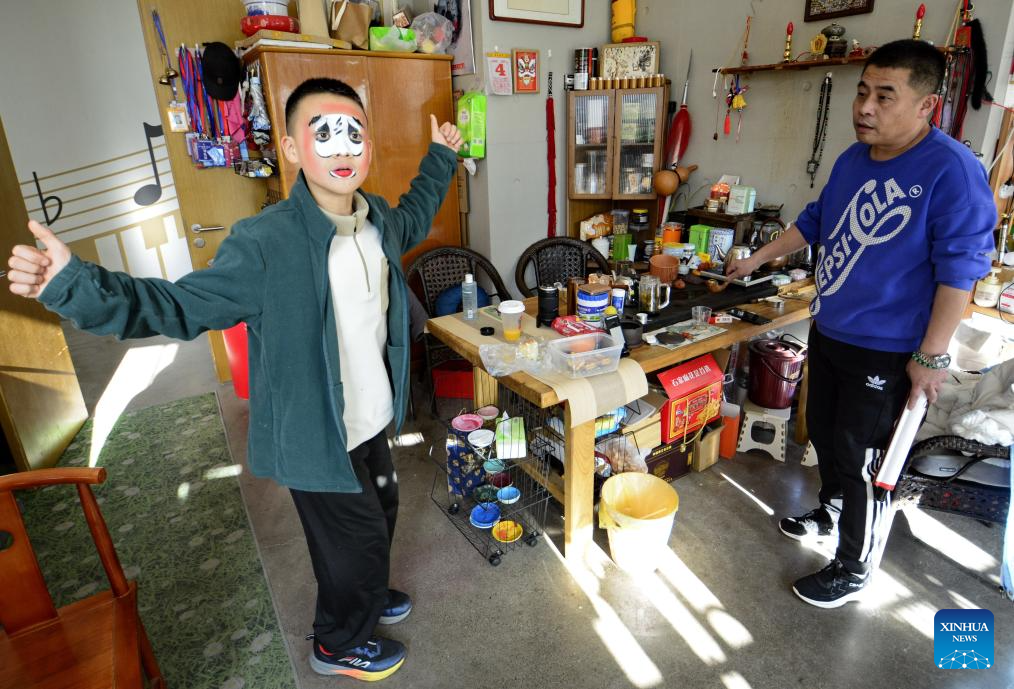 Yang Qiang teaches Peking Opera performance to a student in Beijing, capital of China, Jan. 8, 2025. (Xinhua/Li Xin)