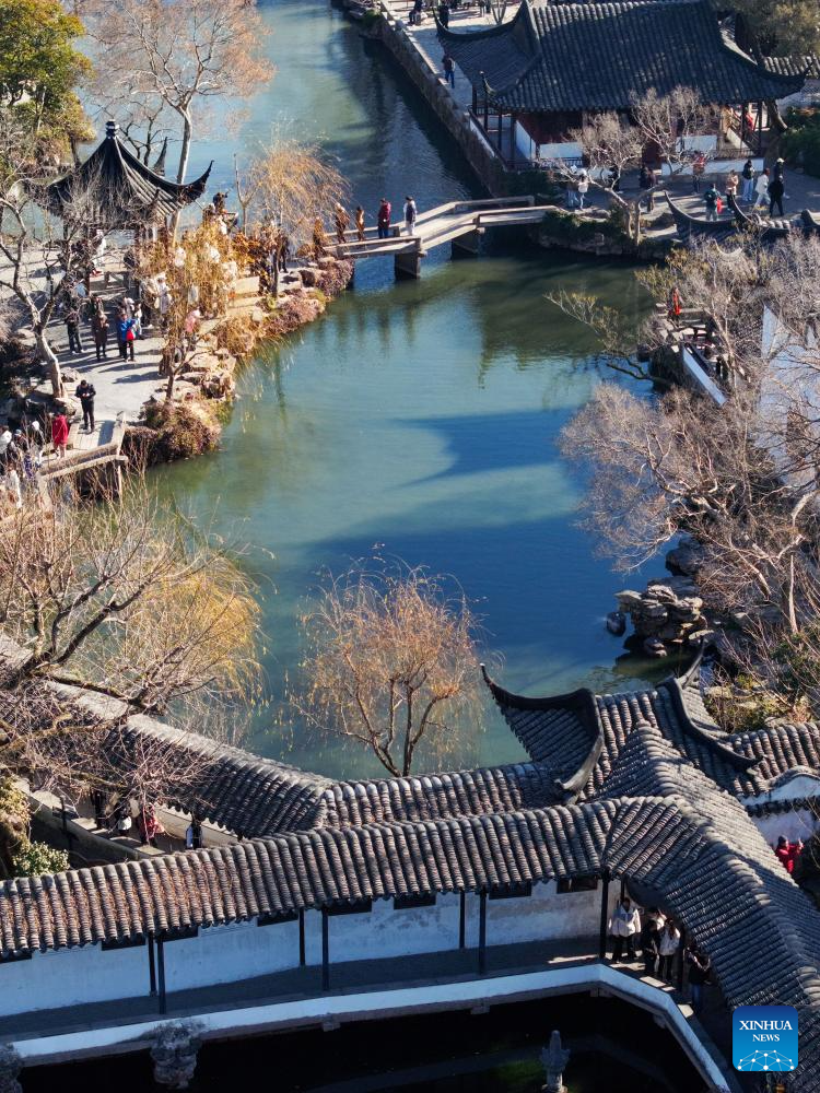 An aerial drone photo taken on Jan. 9, 2025 shows tourists visiting the Humble Administrator's Garden in Suzhou, east China's Jiangsu Province. The Humble Administrator's Garden was inscribed in the list of World Cultural Heritage by the UNESCO in 1997. (Xinhua/Li Bo)