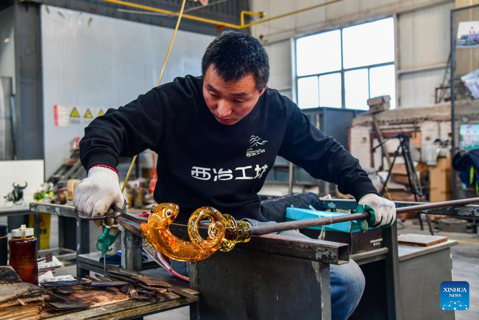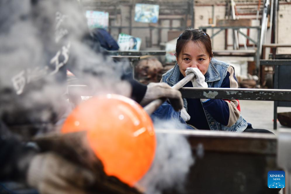 A worker makes colored glaze crafts in Boshan district of Zibo City, east China's Shandong Province, Jan. 9, 2025. Boshan district of Zibo city is well-known for the industry of colored glaze making. As the Spring Festival, or Chinese Lunar New Year, approaches, decorative colored glaze crafts made in Boshan won popularity among customers. (Xinhua/Zhu Zheng)