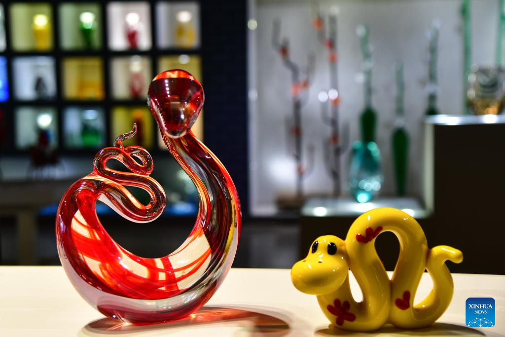 Colored glaze crafts themed on the Year of the Snake are seen in Boshan district of Zibo City, east China's Shandong Province, Jan. 9, 2025. Boshan district of Zibo city is well-known for the industry of colored glaze making. As the Spring Festival, or Chinese Lunar New Year, approaches, decorative colored glaze crafts made in Boshan won popularity among customers. (Xinhua/Zhu Zheng)