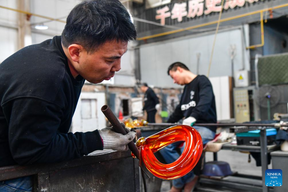 A piece of colored glaze craft is processed in Boshan district of Zibo City, east China's Shandong Province, Jan. 9, 2025. Boshan district of Zibo city is well-known for the industry of colored glaze making. As the Spring Festival, or Chinese Lunar New Year, approaches, decorative colored glaze crafts made in Boshan won popularity among customers. (Xinhua/Zhu Zheng)