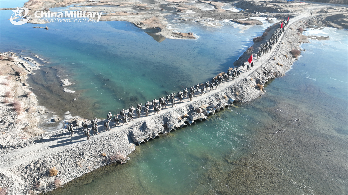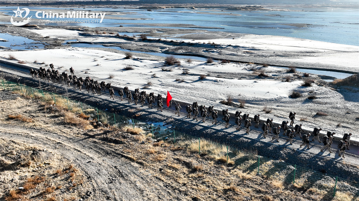 Soldiers assigned to a regiment of the Chinese PLA Xizang Military Command march forward in line during the foot march training on December 23, 2024. (eng.chinamil.com.cn/Photo by Chen Yuji)
