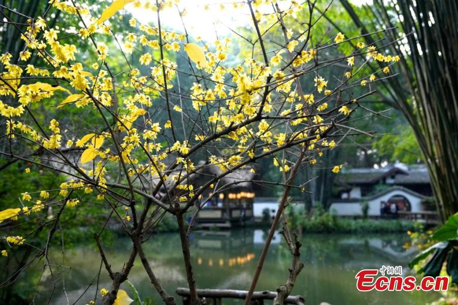 Wax flower is in full blossom at the Chengdu Du Fu Thatched Cottage Museum, drawing many visitors to southwest China's Sichuan Province, Jan. 9, 2025. (China News Service/An Yuan)