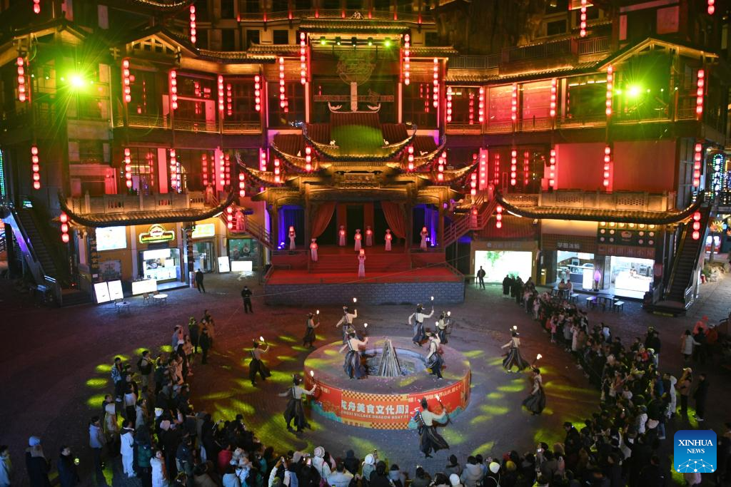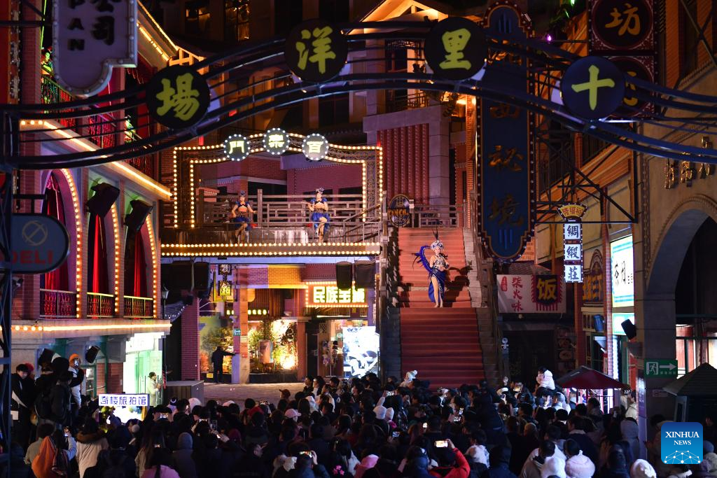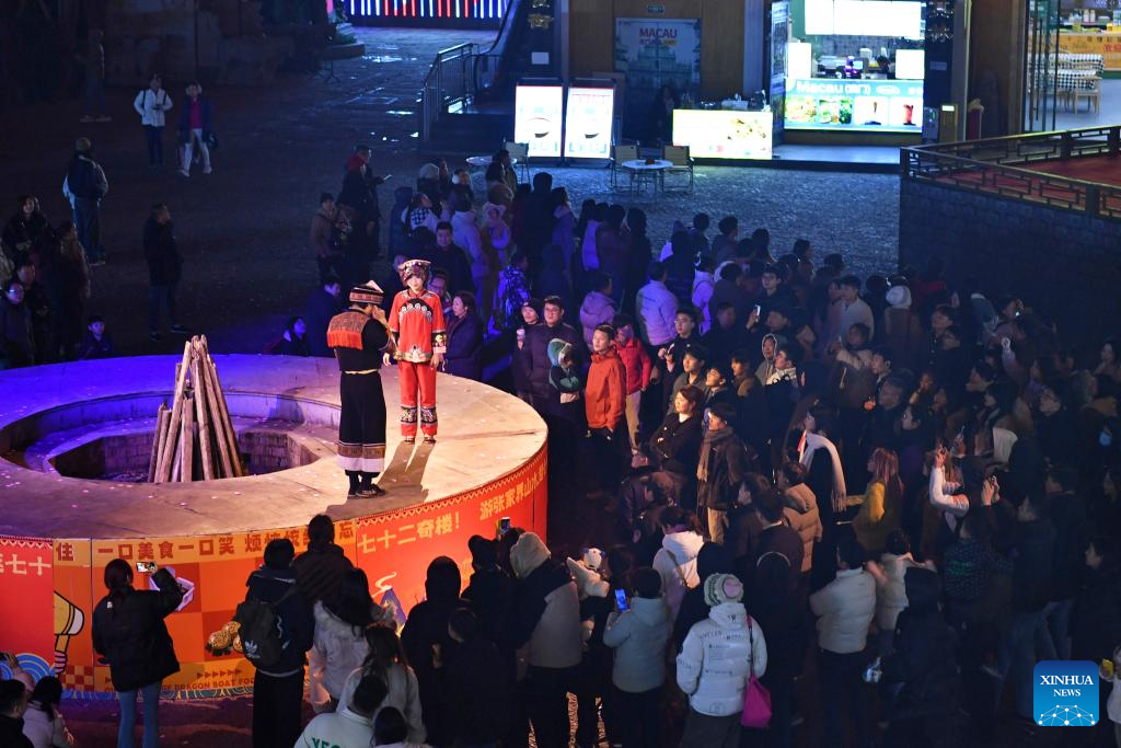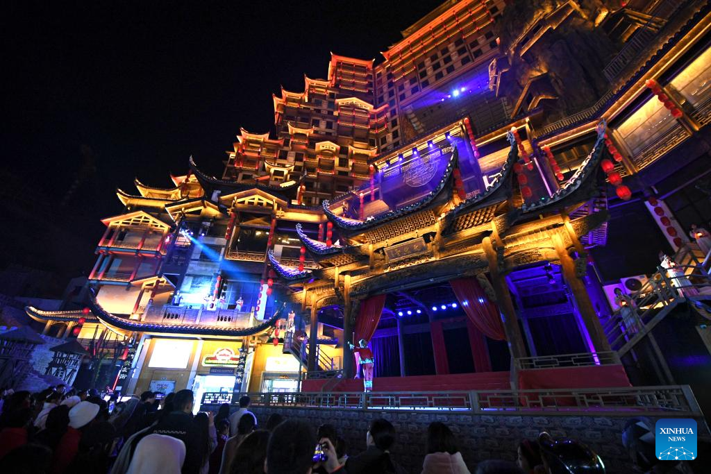 Tourists watch stage performance at a scenic spot noted for a splendid building in Zhangjiajie, central China's Hunan Province, on Jan. 9, 2025. The stilted structure standing more than 100 meters tall has been a cultural landmark and attraction for night visit of Zhangjiajie, one of the World Natural Heritage sites in China. (Xinhua/Chen Zhenhai)