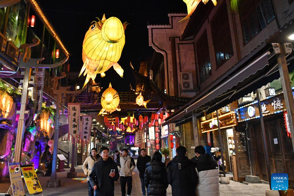 Tourists visit a scenic spot noted for its splendid building in Zhangjiajie, central China's Hunan Province, on Jan. 9, 2025. The stilted structure standing more than 100 meters tall has been a cultural landmark and attraction for night visit of Zhangjiajie, one of the World Natural Heritage sites in China. (Xinhua/Chen Zhenhai)