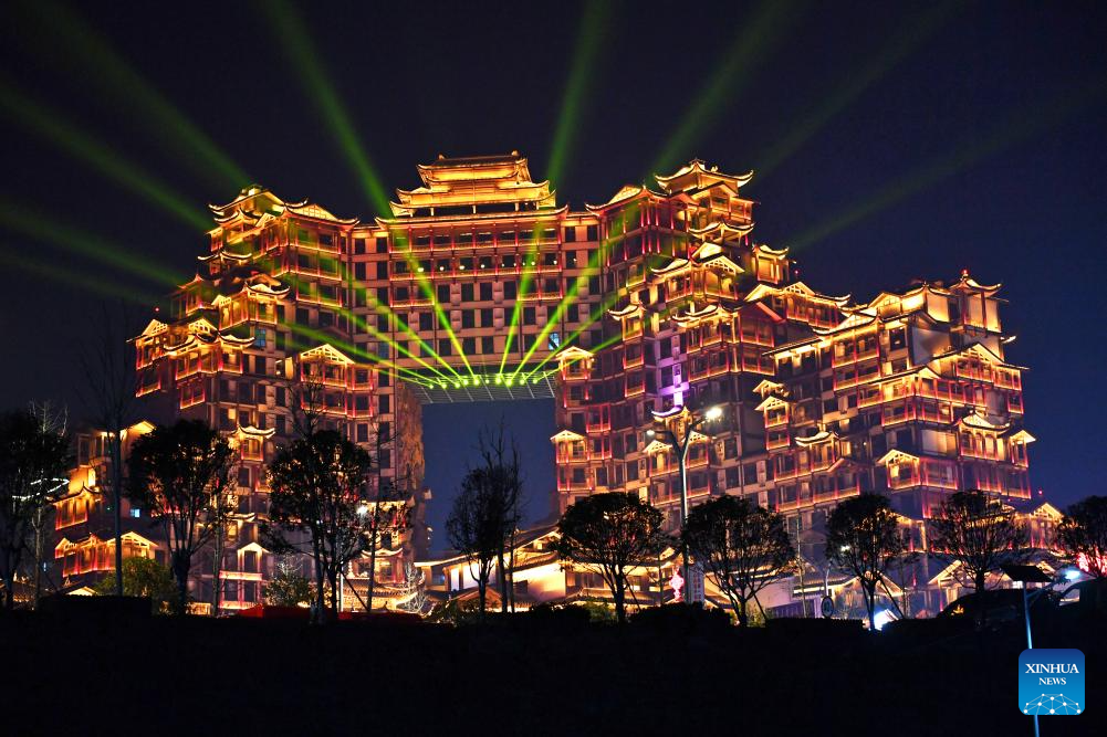 This photo taken on Jan. 9, 2025 shows the night view of a scenic spot noted for its splendid building in Zhangjiajie, central China's Hunan Province. The stilted structure standing more than 100 meters tall has been a cultural landmark and attraction for night visit of Zhangjiajie, one of the World Natural Heritage sites in China. (Xinhua/Chen Zhenhai)