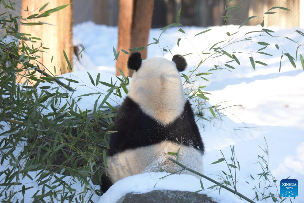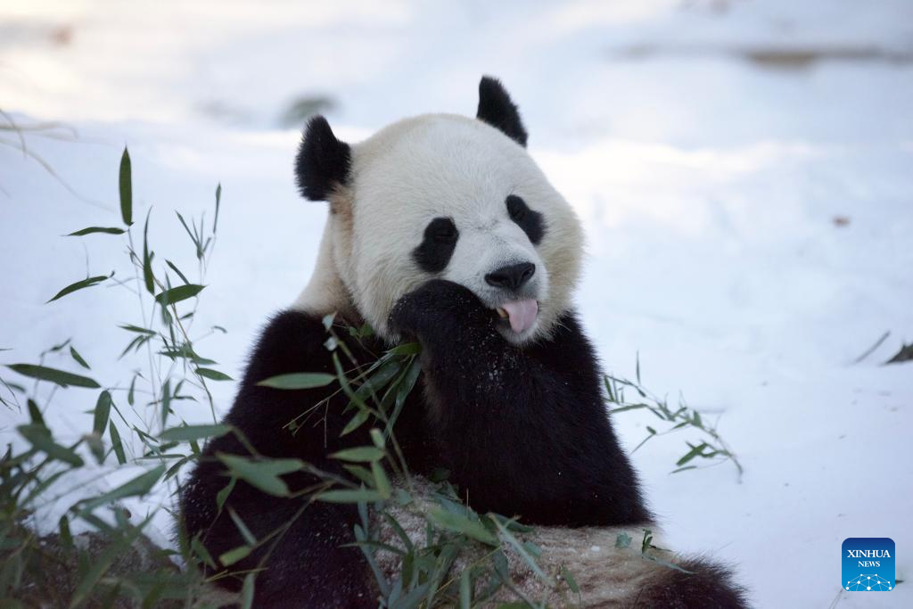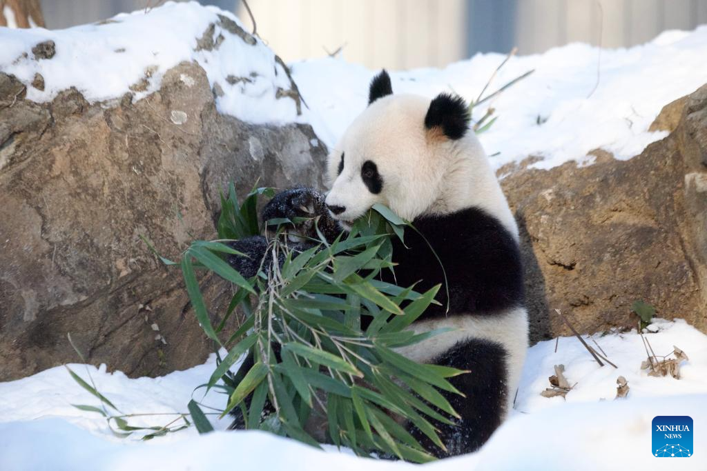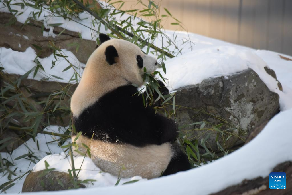 Female giant panda Qing Bao eats bamboo at the Smithsonian's National Zoo in Washington, D.C., the United States, on Jan. 9, 2025. The Smithsonian's National Zoo hosted a media preview event for Chinese media on Jan. 9, where giant pandas Bao Li and Qing Bao made their debut before the press. (Xinhua/Deng Xianlai)