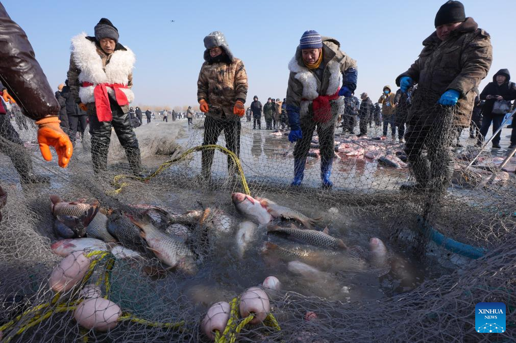 People catch fish at Wolong Lake in Kangping County of Shenyang, northeast China's Liaoning Province, Jan. 11, 2025. A winter fishing-themed cultural and tourism season began here on Saturday. (Xinhua/Li Gang)