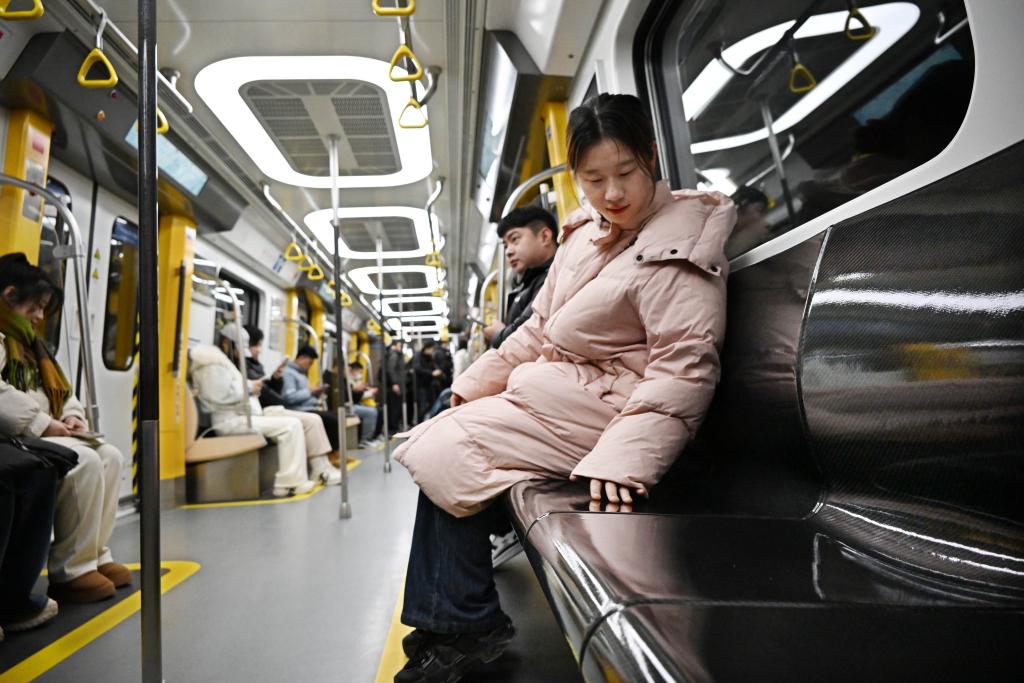 Passengers take a CETROVO 1.0 metro train on the Metro Line 1 in Qingdao, east China's Shandong Province, Jan. 10, 2025. (Xinhua/Li Ziheng)