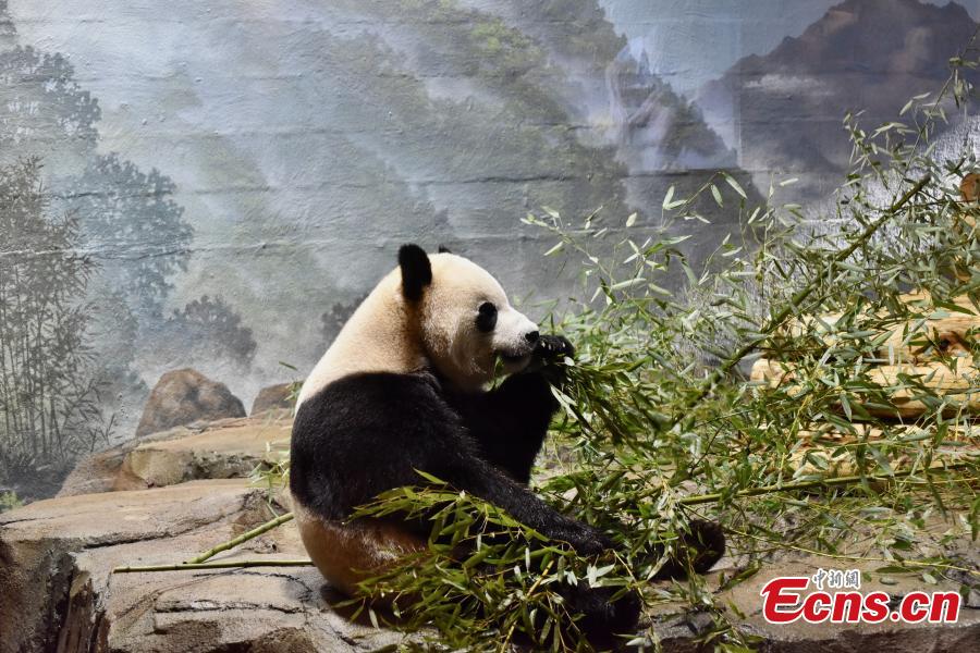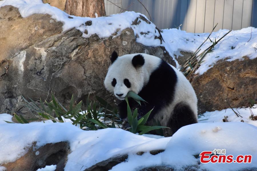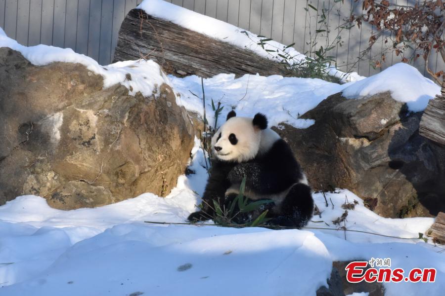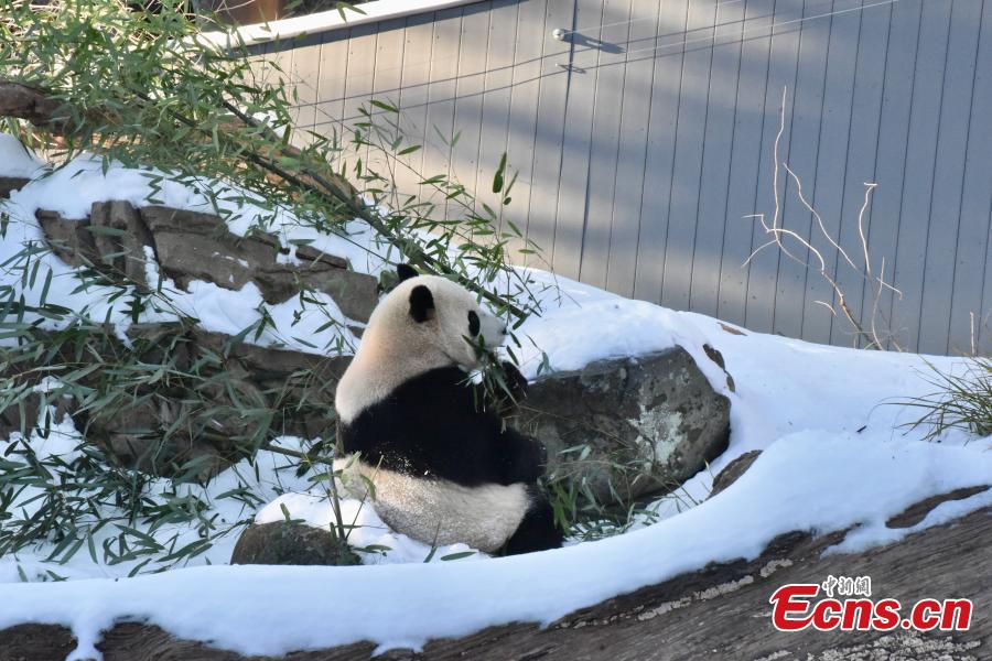 Female giant panda Qing Bao eats bamboo at the Smithsonian's National Zoo in Washington, D.C., the United States, Jan. 9, 2025. (China News Service/Shan Handing)