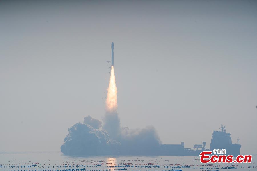 A Smart Dragon-3 rocket carrying the satellite group CentiSpace 01 blasts off from the sea near Haiyang City, east China's Shandong Province, Jan. 13, 2025. (China News Service/Xu Yajing)