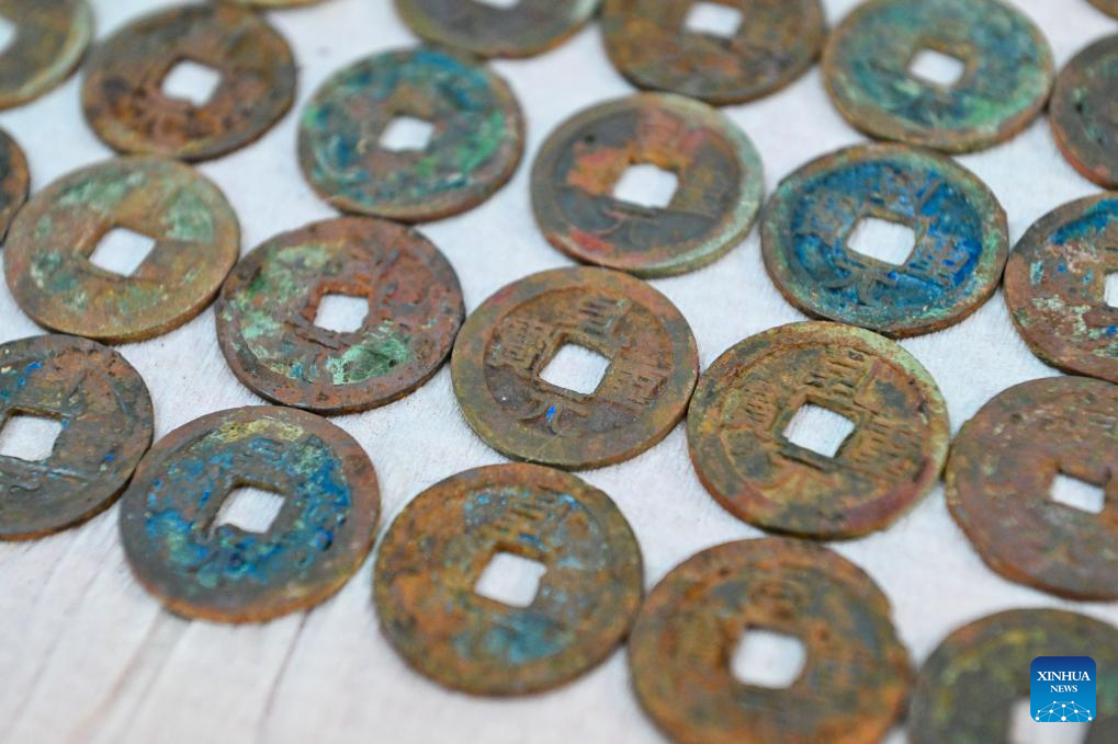 This file photo taken on Oct. 18, 2023 shows the ancient coins excavated from the Youyi Road cemetery in the city of Kuqa, northwest China's Xinjiang Uygur Autonomous Region. (Xinhua/Ding Lei)