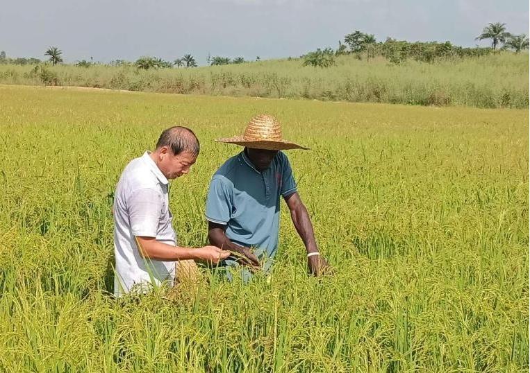 A Chinese rice expert instructs a local farmer in Sierra Leone to prevent and control plant diseases and insect pests. (Photo/Li Youliang)