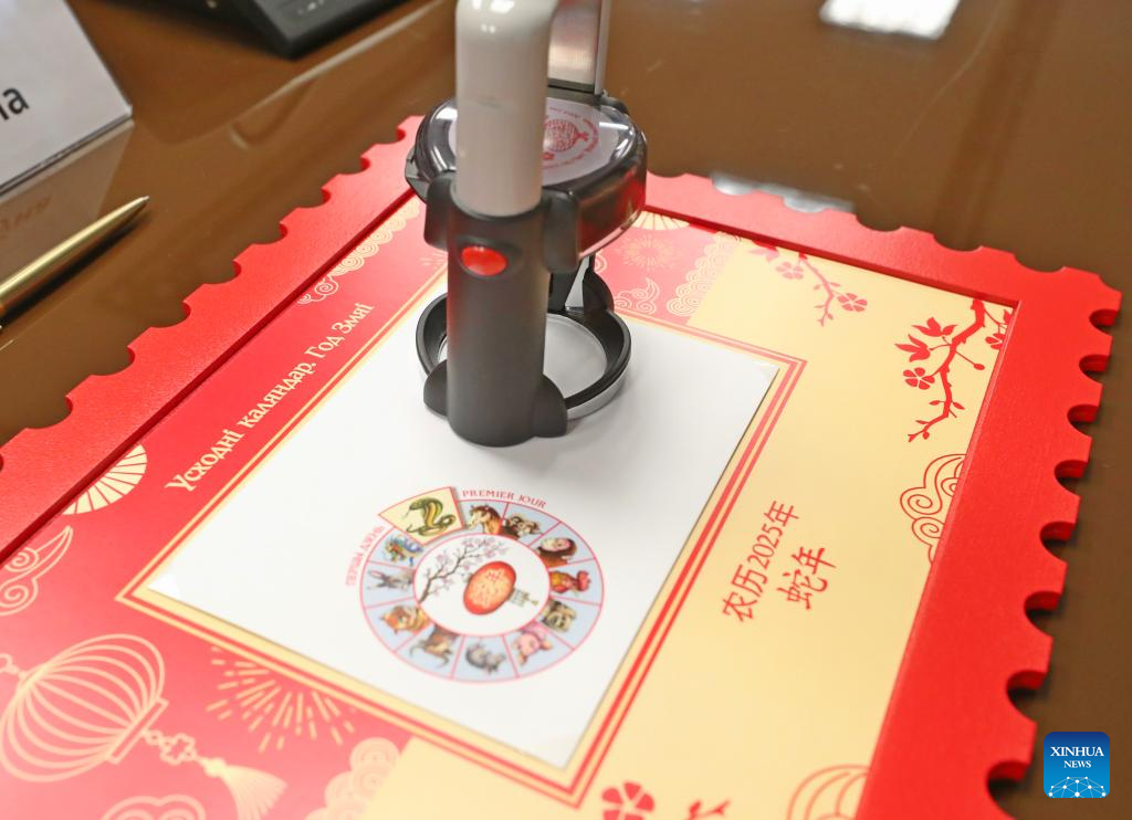 Staff members show the first-day cover of the postage stamps for the "Year of the Snake" from the "Eastern Calendar" series in Minsk, Belarus, Jan. 15, 2025. The set of six stamps, titled "Eastern Calendar: Year of the Snake," consists of an image of a snake in the center. The lower right corner features the Chinese word for "Snake" along with the phrase "Year of the Snake" written in Belarusian. (Photo by Henadz Zhinkov/Xinhua)