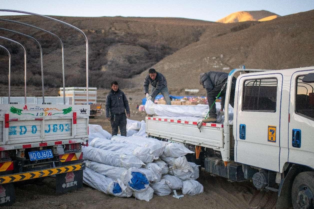 Volunteers unload tents from a pickup truck at a resettlement site in Gurum, Chamco township, Dingri county, southwest China's Xizang autonomous region, Jan. 8, 2025. (People's Daily Online/Weng Qiyu)