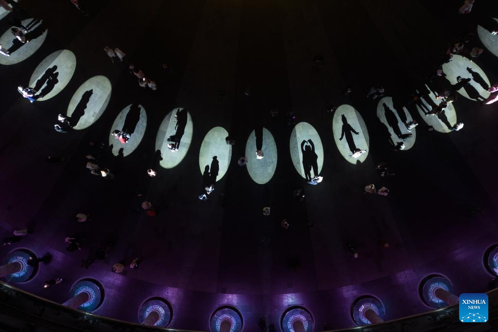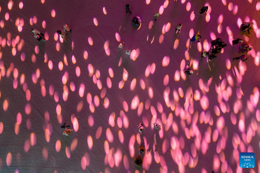 An aerial drone photo shows tourists enjoying a light show at the Harbin Ice-Snow World in Harbin, northeast China's Heilongjiang Province, Jan. 15, 2025. This winter, Harbin is drawing tourists with its stunning winter landscape, fueling a significant boom in its ice and snow tourism industry. (Xinhua/Zhang Tao)