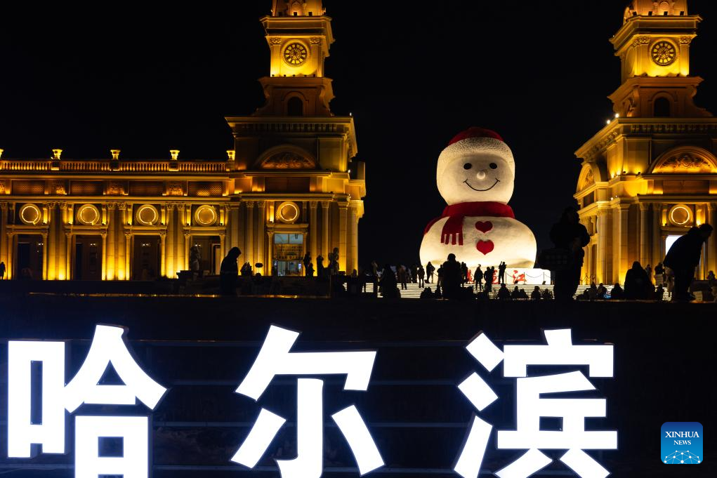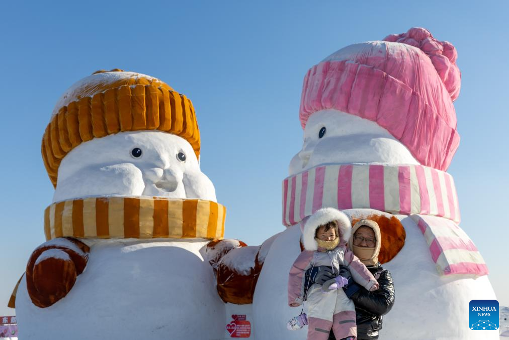 Tourists have fun around a giant snowman in Harbin, northeast China's Heilongjiang Province, Jan. 15, 2025. This winter, Harbin is drawing tourists with its stunning winter landscape, fueling a significant boom in its ice and snow tourism industry. (Xinhua/Zhang Tao)