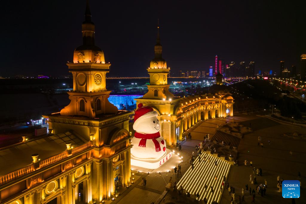 An aerial drone photo shows tourists having fun around a giant snowman in Harbin, northeast China's Heilongjiang Province, Jan. 15, 2025. This winter, Harbin is drawing tourists with its stunning winter landscape, fueling a significant boom in its ice and snow tourism industry. (Xinhua/Zhang Tao)