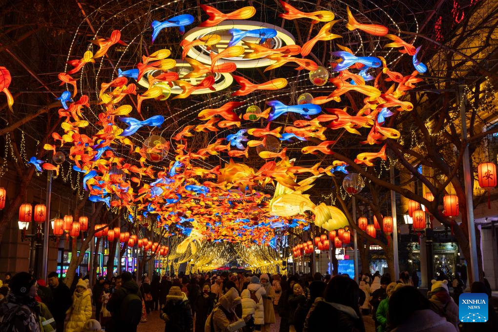 Tourists have fun at the Central Street in Harbin, northeast China's Heilongjiang Province, Jan. 13, 2025. This winter, Harbin is drawing tourists with its stunning winter landscape, fueling a significant boom in its ice and snow tourism industry. (Xinhua/Zhang Tao)