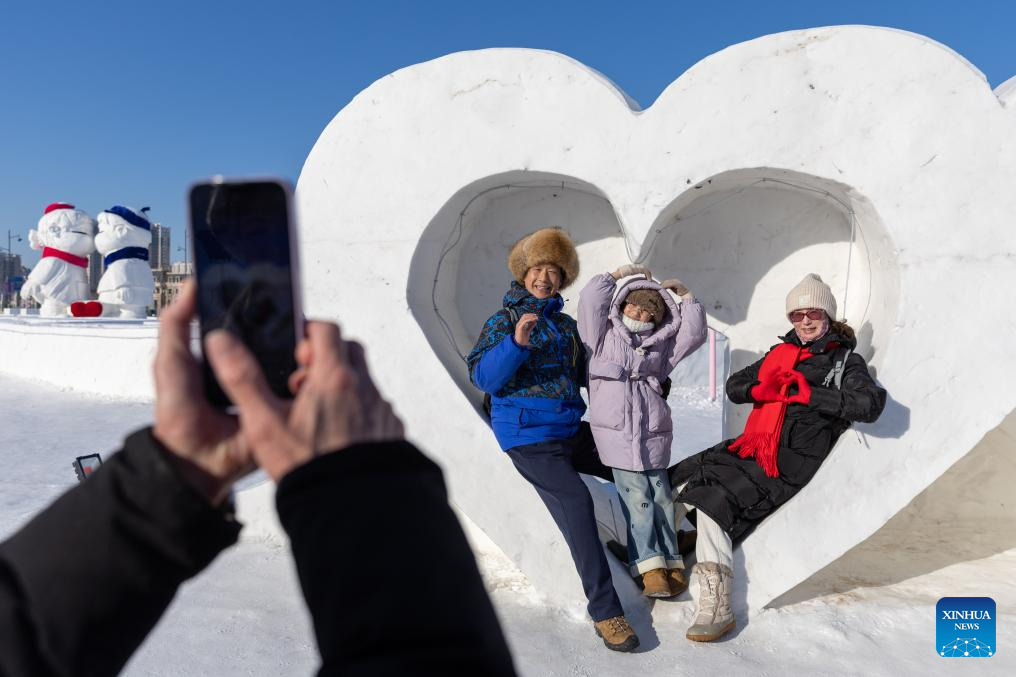 Tourists pose for photos at an architecture art square in Harbin, northeast China's Heilongjiang Province, Jan. 13, 2025. This winter, Harbin is drawing tourists with its stunning winter landscape, fueling a significant boom in its ice and snow tourism industry. (Xinhua/Zhang Tao)