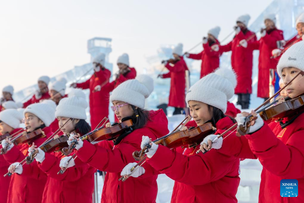 Young violinists perform at the Harbin Ice-Snow World in Harbin, northeast China's Heilongjiang Province, Jan. 12, 2025. This winter, Harbin is drawing tourists with its stunning winter landscape, fueling a significant boom in its ice and snow tourism industry. (Xinhua/Zhang Tao)