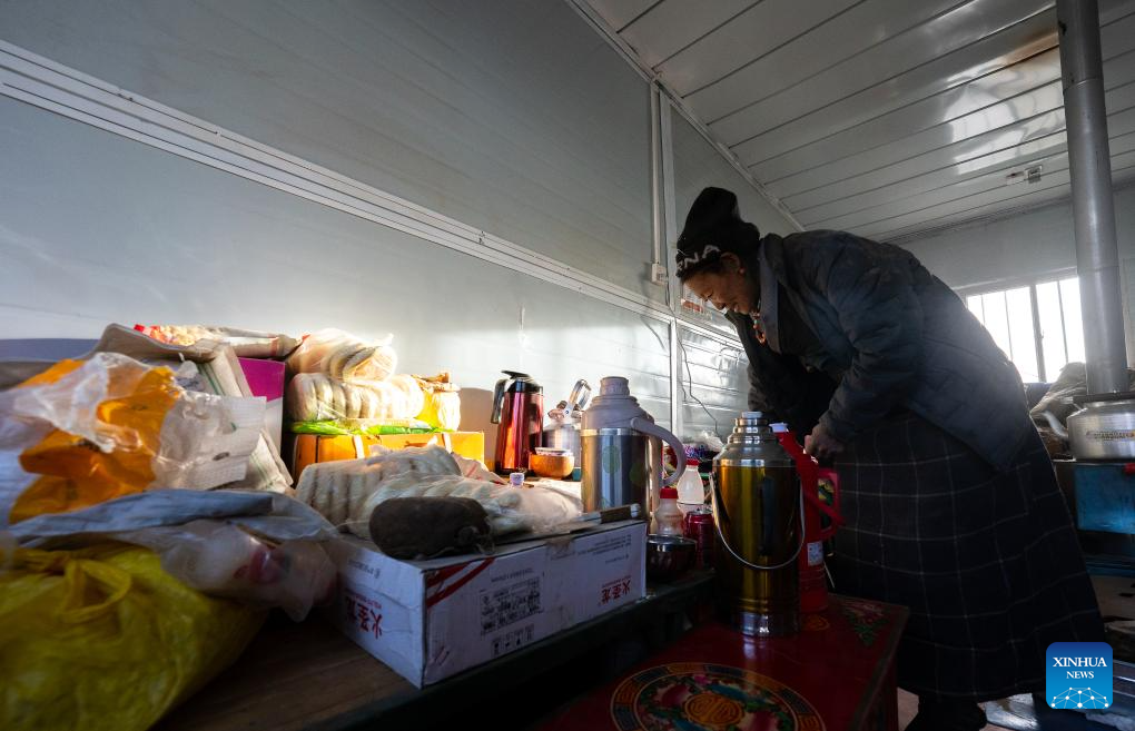 A woman cleans her room in a makeshift house in Chamco Township, Dingri County in Xigaze, southwest China's Xizang Autonomous Region, Jan. 15, 2025. The disaster relief work in quake-hit Dingri County including makeshift houses construction, supply transportation and debris removal work have been accelerated to better meet the needs and improve the living conditions of the residents. (Xinhua/Tenzin Nyida)