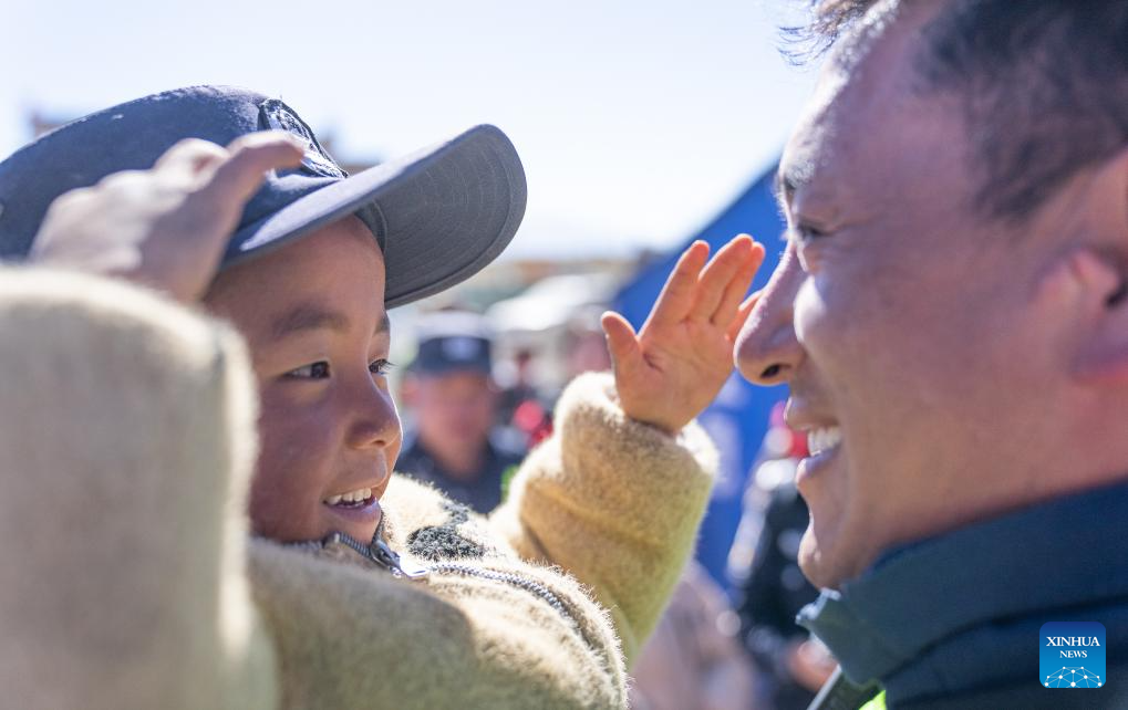 A boy wearing a cap of police salutes at Gabo Village in Chamco Township, Dingri County in Xigaze, southwest China's Xizang Autonomous Region, Jan. 14, 2025. The disaster relief work in quake-hit Dingri County including makeshift houses construction, supply transportation and debris removal work have been accelerated to better meet the needs and improve the living conditions of the residents. (Xinhua/Tenzin Nyida)