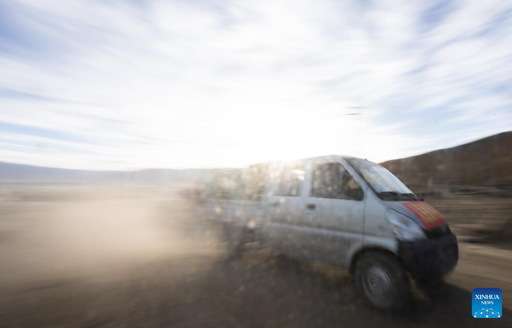 A vehicle loaded with supplies moves to Gurum Village in Chamco Township, Dingri County in Xigaze, southwest China's Xizang Autonomous Region, Jan. 15, 2025. The disaster relief work in quake-hit Dingri County including makeshift houses construction, supply transportation and debris removal work have been accelerated to better meet the needs and improve the living conditions of the residents. (Xinhua/Tenzin Nyida)