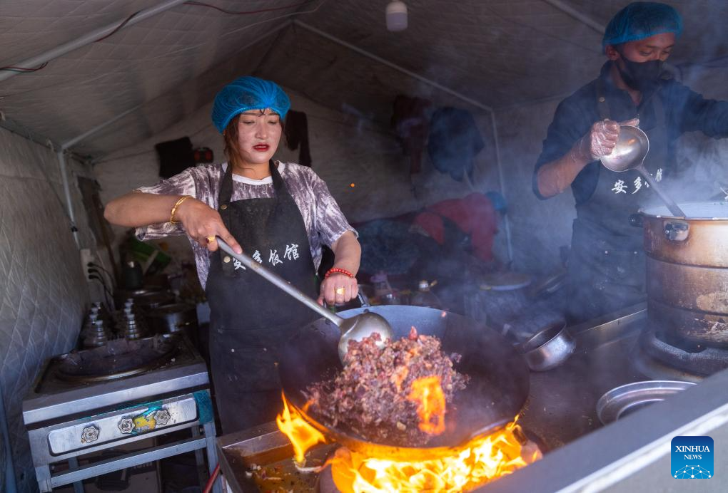 Chefs from a restaurant make meals for residents at a resettlement site in Chamco Township, Dingri County in Xigaze, southwest China's Xizang Autonomous Region, Jan. 15, 2025. The disaster relief work in quake-hit Dingri County including makeshift houses construction, supply transportation and debris removal work have been accelerated to better meet the needs and improve the living conditions of the residents. (Xinhua/Tenzin Nyida)