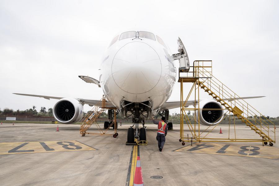 This photo taken on Jan. 16, 2025 shows a Boeing B787-9 aircraft of Mongolian Airlines parked at the one-stop aircraft maintenance base of Hainan Free Trade Port in Haikou, south China's Hainan Province. (Xinhua/Zhang Liyun)
