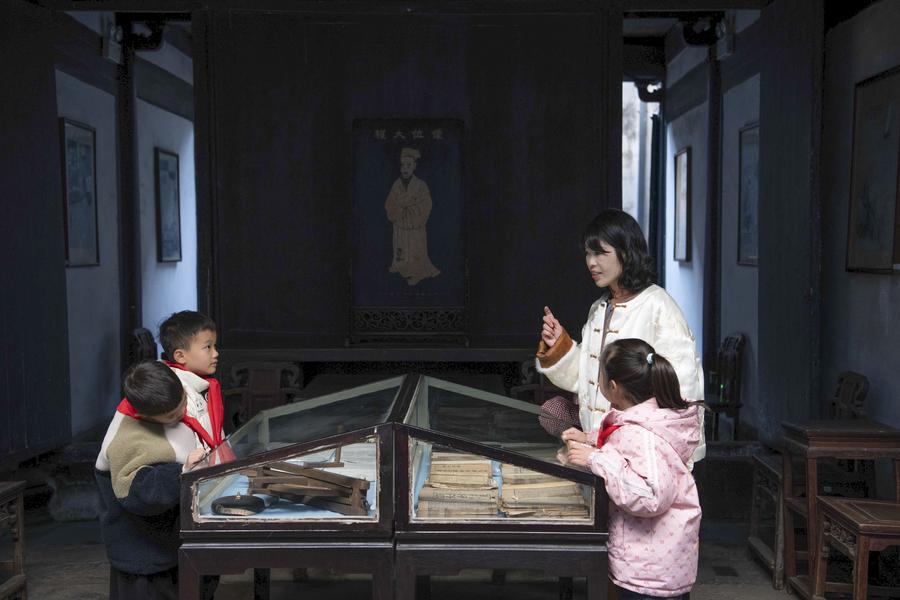 Wang Suqiu teaches abacus knowledge to students at Cheng Dawei Abacus Museum in Tunxi District, Huangshan, east China's Anhui Province, Jan. 9, 2025. (Xinhua/Zhang Duan)