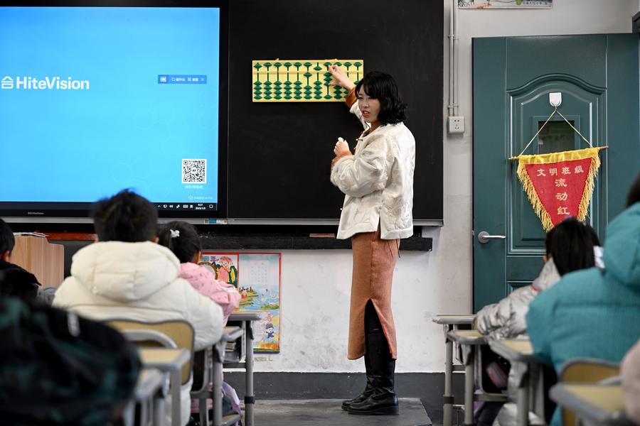 Wang Suqiu teaches abacus calculation at Dawei Primary School in Tunxi District, Huangshan, east China's Anhui Province, Jan. 9, 2025. (Xinhua/Huang Bohan)