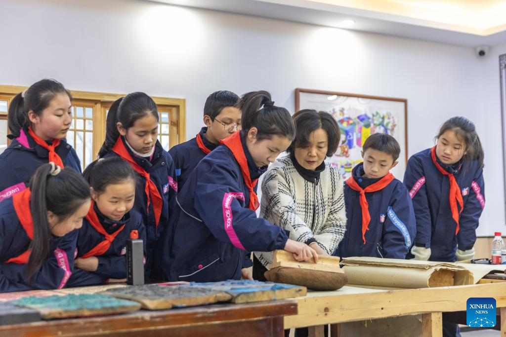 Mo Shaoping (3rd R), an intangible cultural heritage inheritor of Liangping Woodblock New Year Pictures, instructs students with woodblock printing in Liangping District of southwest China's Chongqing, Jan. 15, 2025.