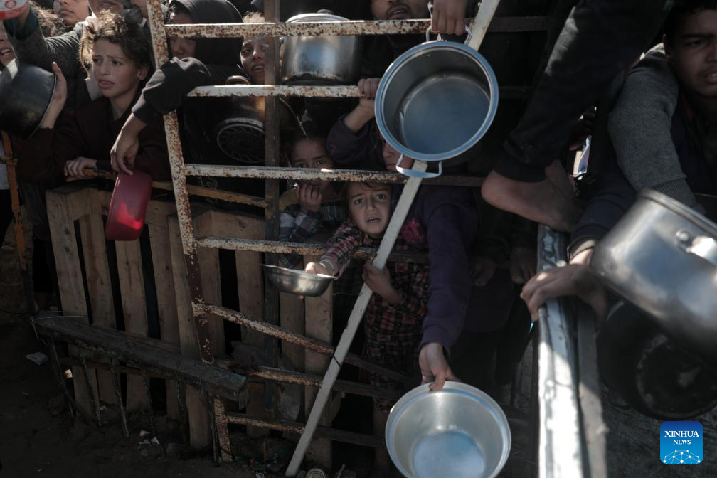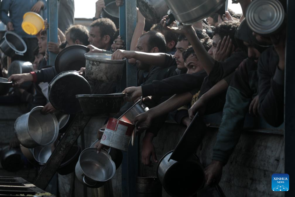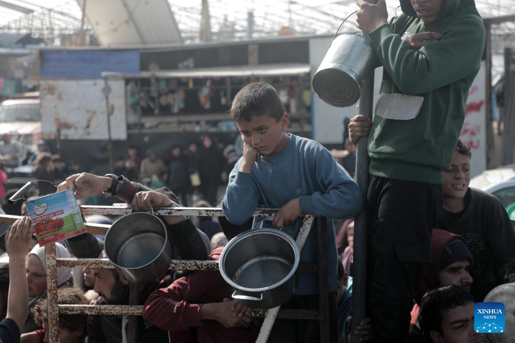 Palestinians wait to receive free food from a food distribution center in the southern Gaza Strip City of Khan Younis, Jan. 17, 2025. (Photo by Rizek Abdeljawad/Xinhua)