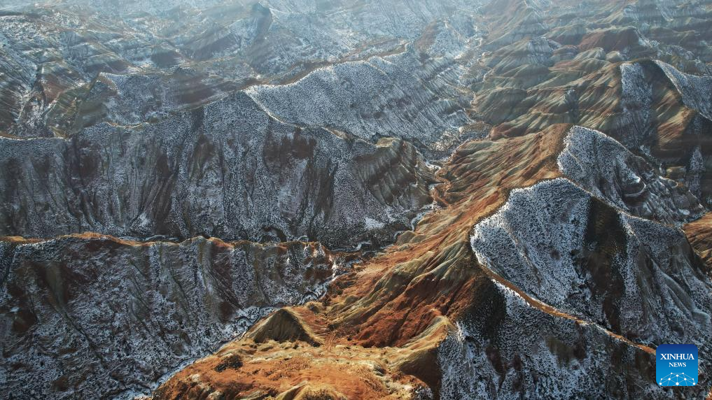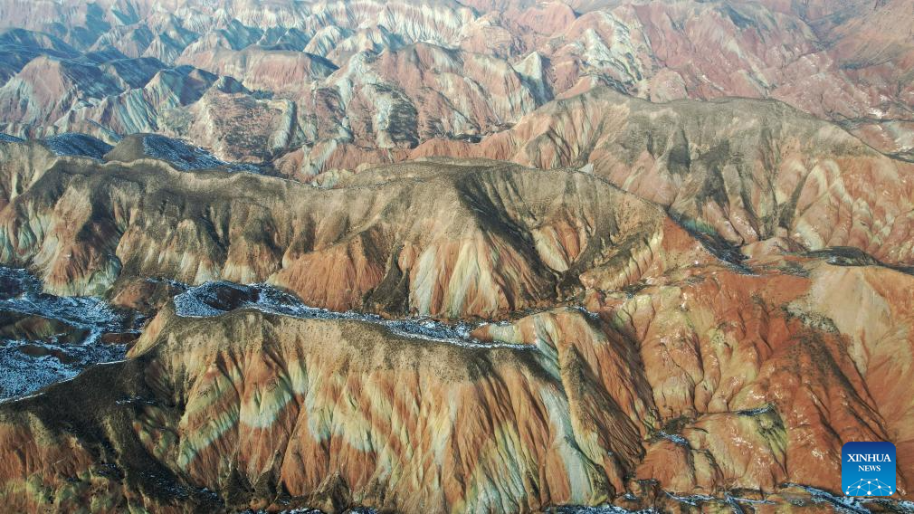 An aerial drone photo taken on Jan. 17, 2025 shows a view of the Danxia landform, characterized by reddish sandstone features, at the Shuimo Danxia scenic area in Lanzhou, northwest China's Gansu Province. (Xinhua/Chen Bin)