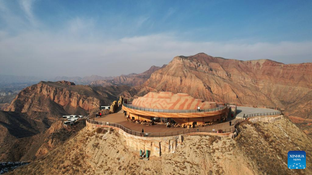 An aerial drone photo taken on Jan. 17, 2025 shows tourists viewing the Danxia landform, characterized by reddish sandstone features, from an observation deck at the Shuimo Danxia scenic area in Lanzhou, northwest China's Gansu Province. (Xinhua/Chen Bin)