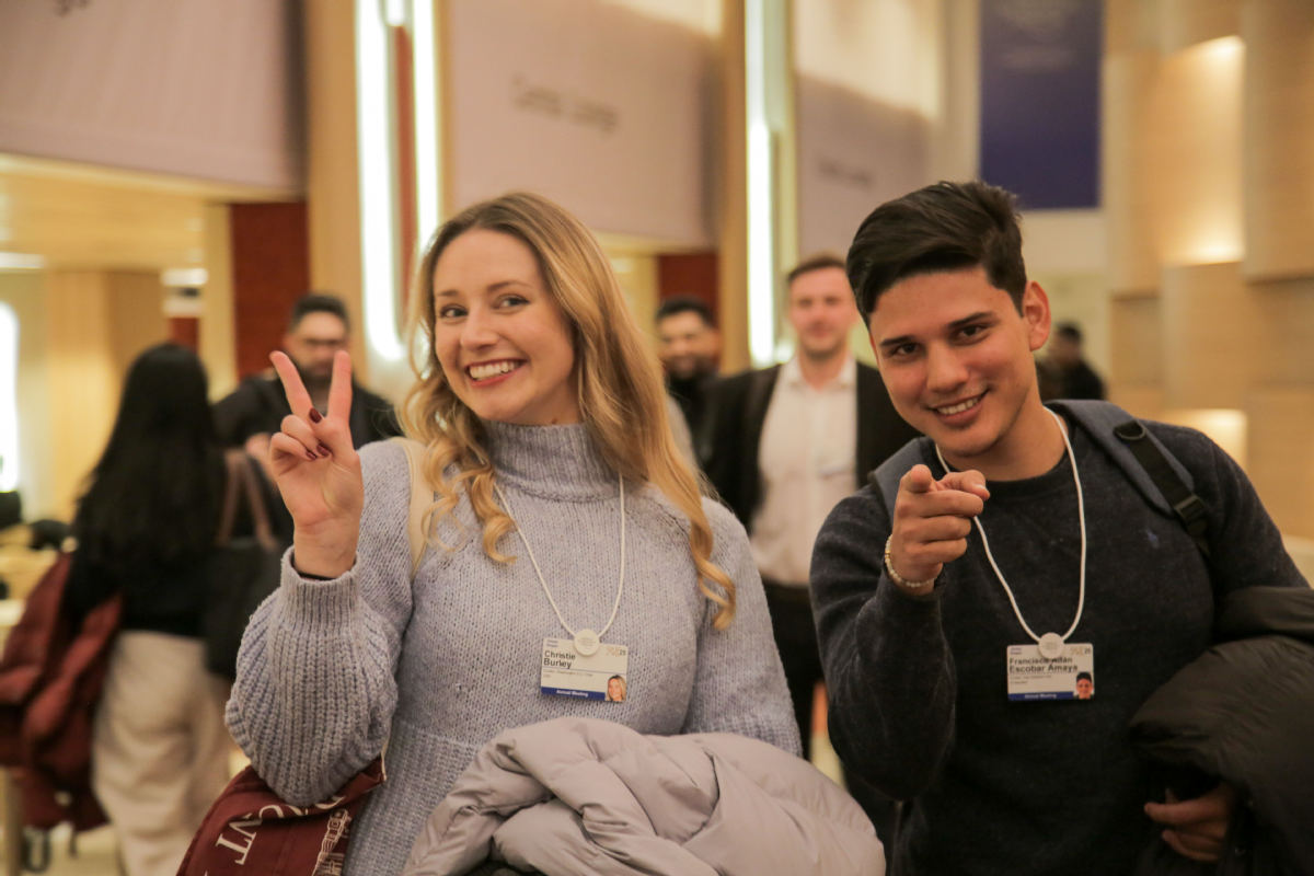 Participants pose for photos at the main venue of the World Economic Forum Annual Meeting in Davos, Switzerland, on Sunday. (Xing Yi/China Daily)