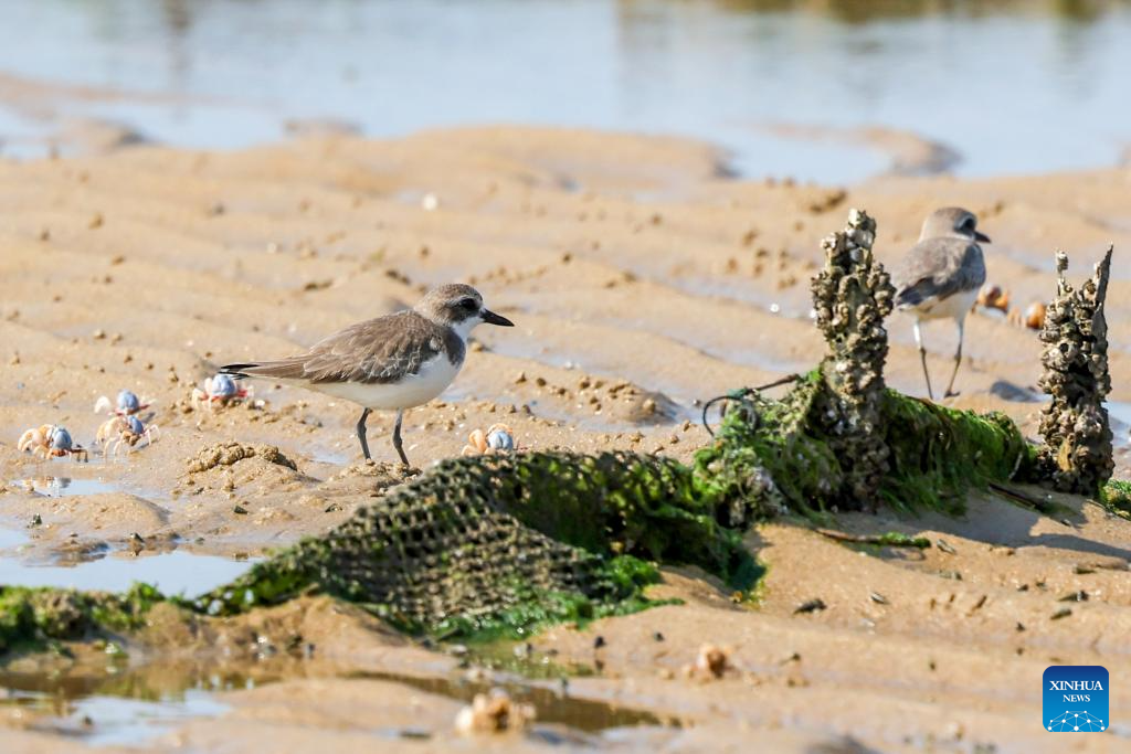 This photo taken on Jan. 18, 2025 shows lesser sand plovers on a beach in Danzhou City, south China's Hainan Province. The ecological environment in Hainan has been improving in recent years thanks to the protection of wetlands and birds by the local government, attracting an increasing number of migrant birds wintering here. (Xinhua/Zhang Liyun)