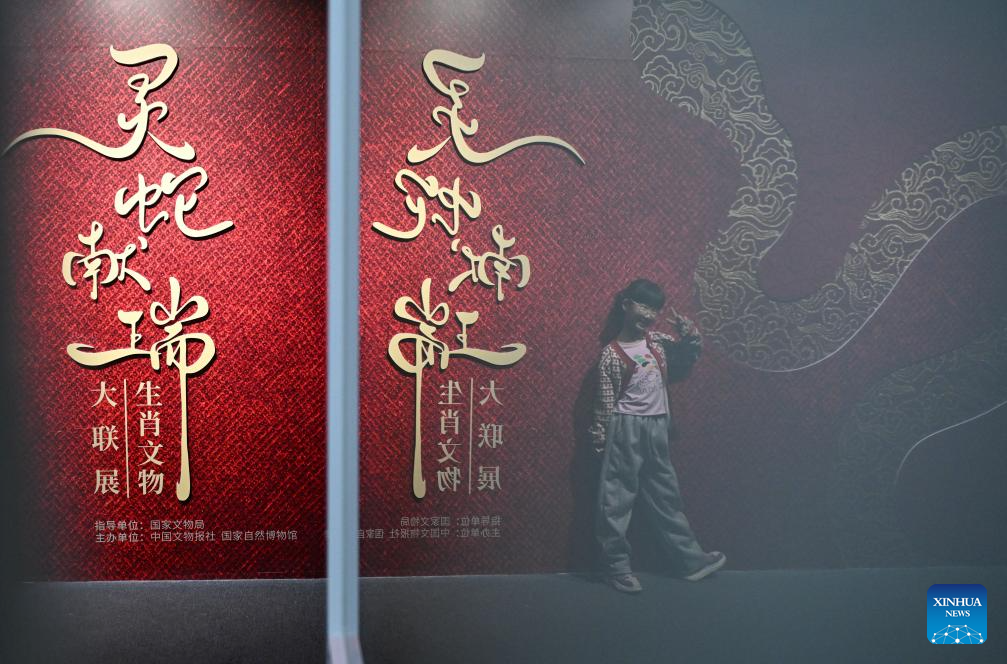 A girl poses for photos at a Chinese zodiac cultural relics joint exhibition for the 2025 Year of the Snake held at the Natural History Museum of China in Beijing, China, Jan. 18, 2025. Some 50 snake specimens and a large number of snake-related cultural relics, handicrafts as well as exhibition panels were on display during the exhibition, showcasing the diverse images and meanings of snakes in the Chinese culture. (Xinhua/Chen Zhonghao)